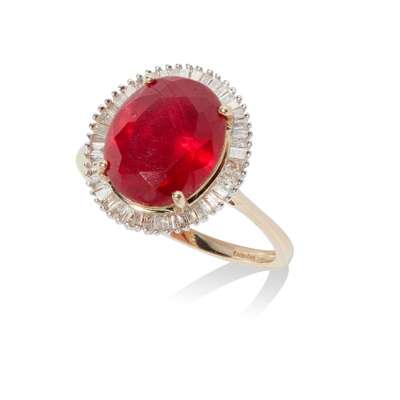 claw set with an oval-cut ruby in a border of baguette-cut diamonds, to a plain 9ct gold shank