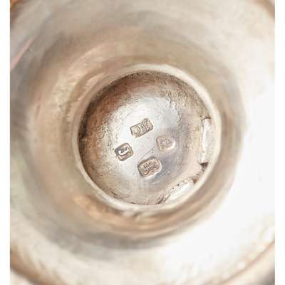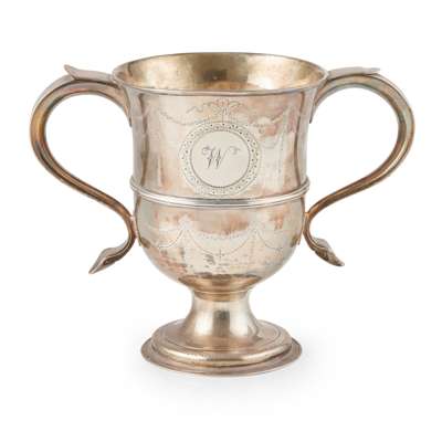 William Champion, London 1781, the deep bowl with threaded waist, engraved swags throughout, the circular cartouches to center with engraved foliate W to either side, the handles of S scroll form, the spreading stem to a circular foot with engraved border