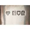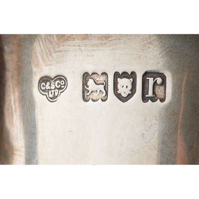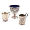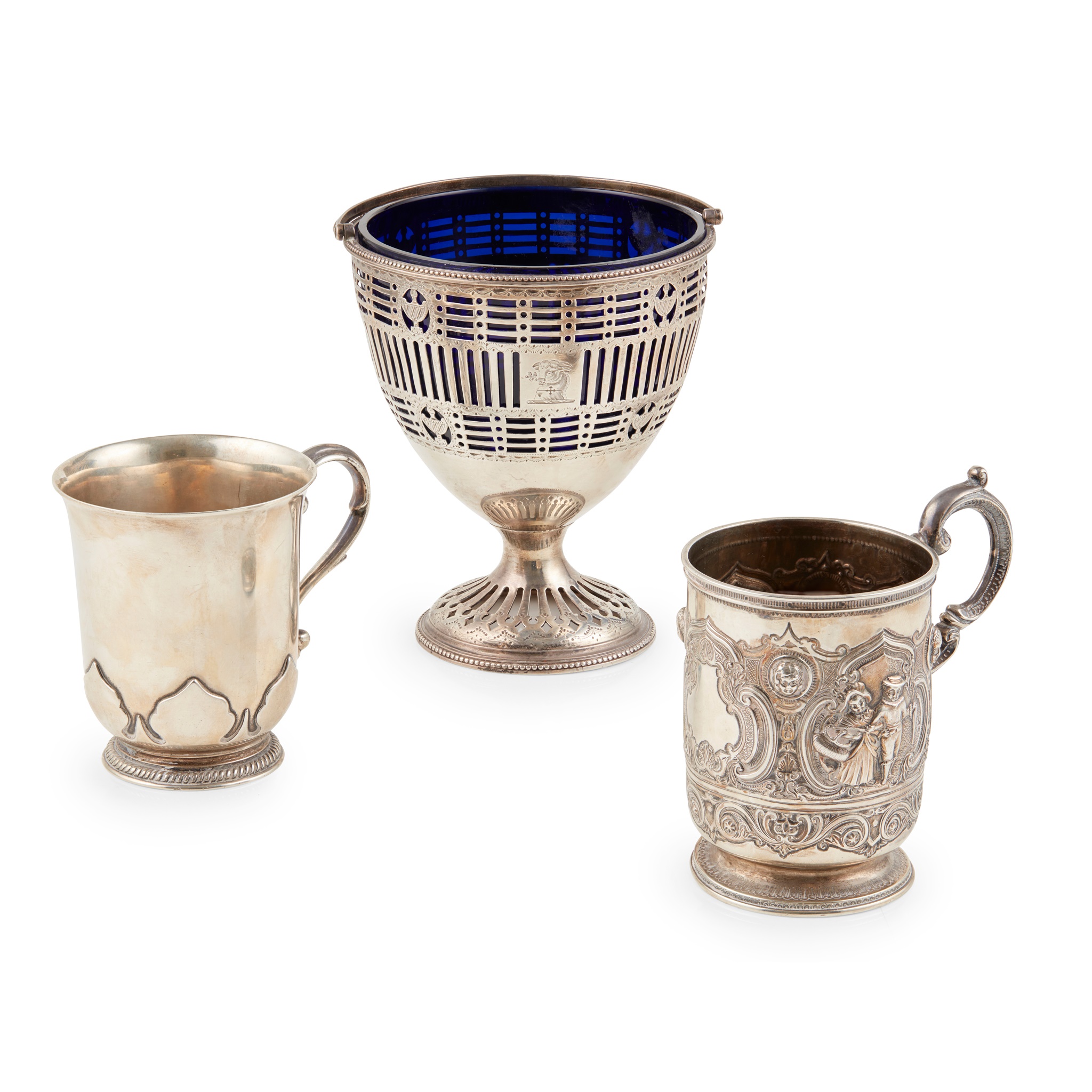 London, circa 1780, of vase form, beaded border, reticulated body, plain pedestal foot, blue glass liner; together with a Scottish christening mug, DC Rait, Glasgow, the baluster body decorated with figures, scroll handle; a plain baluster mug, Goldsmiths Company, London, of baluster form, applied cut card work to the lower part, gadrooned detail to foot