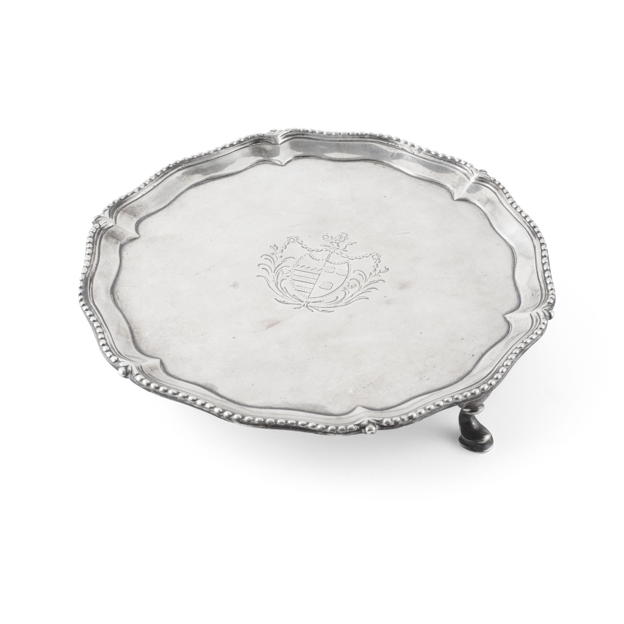 Richard Rugg, London 1774, of moulded circular outline with beaded border, engraved armorial to centre, raised on three hoof feet