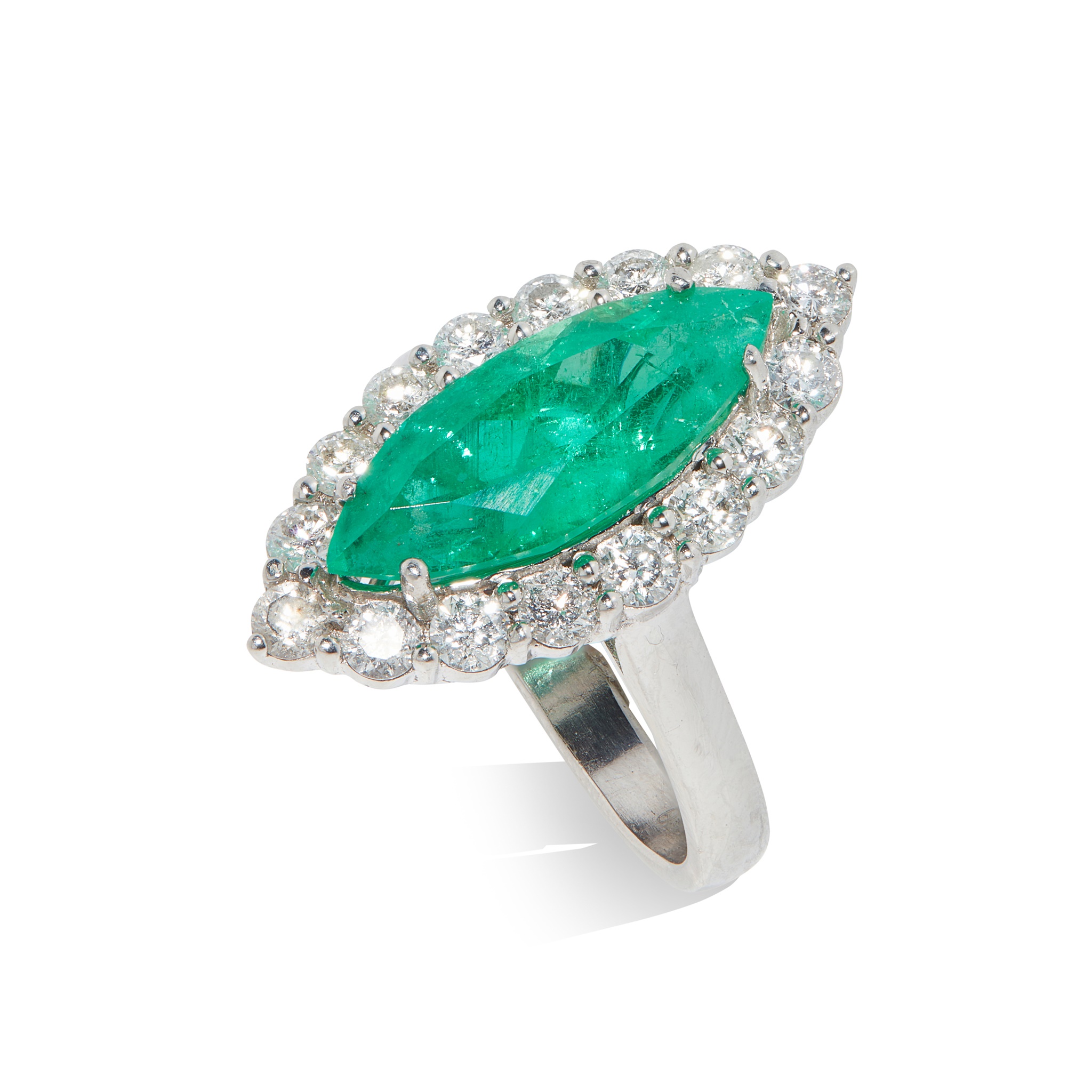 claw set with a marquise-cut emerald, in a border of graduated round brilliant-cut diamonds, to a plain platinum shank