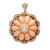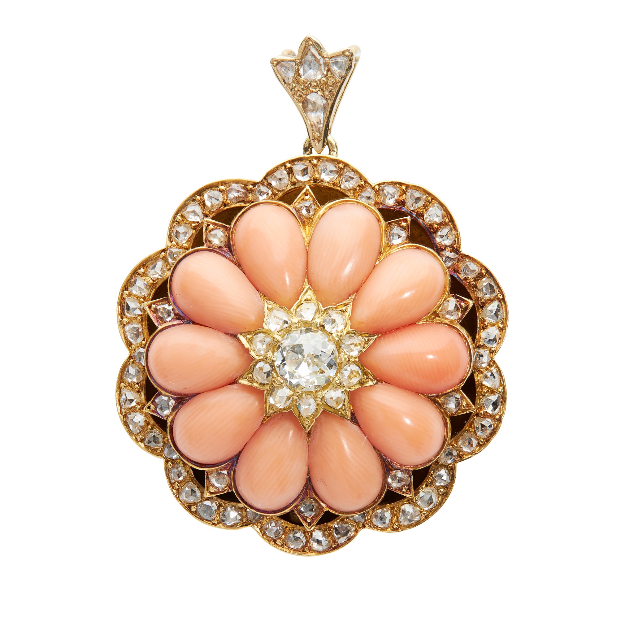 of circular outline, set with a central old round-cut diamond, in a border of rose-cut diamonds and pear-shaped cabochon corals, glazed panel to reverse, unmarked