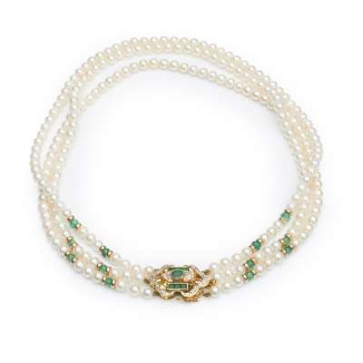 composed of three rows of cultured pearls, each strand with four emerald bead spacers, to an 18ct gold pierced emerald and diamond set clasp