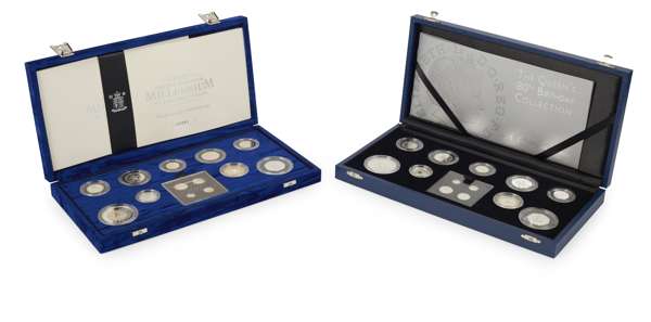 from £5 down to Maundy penny; tougher with a Millennium Collection silver proof set from £5 down to Maundy penny, both in case of issue with certificate etc.