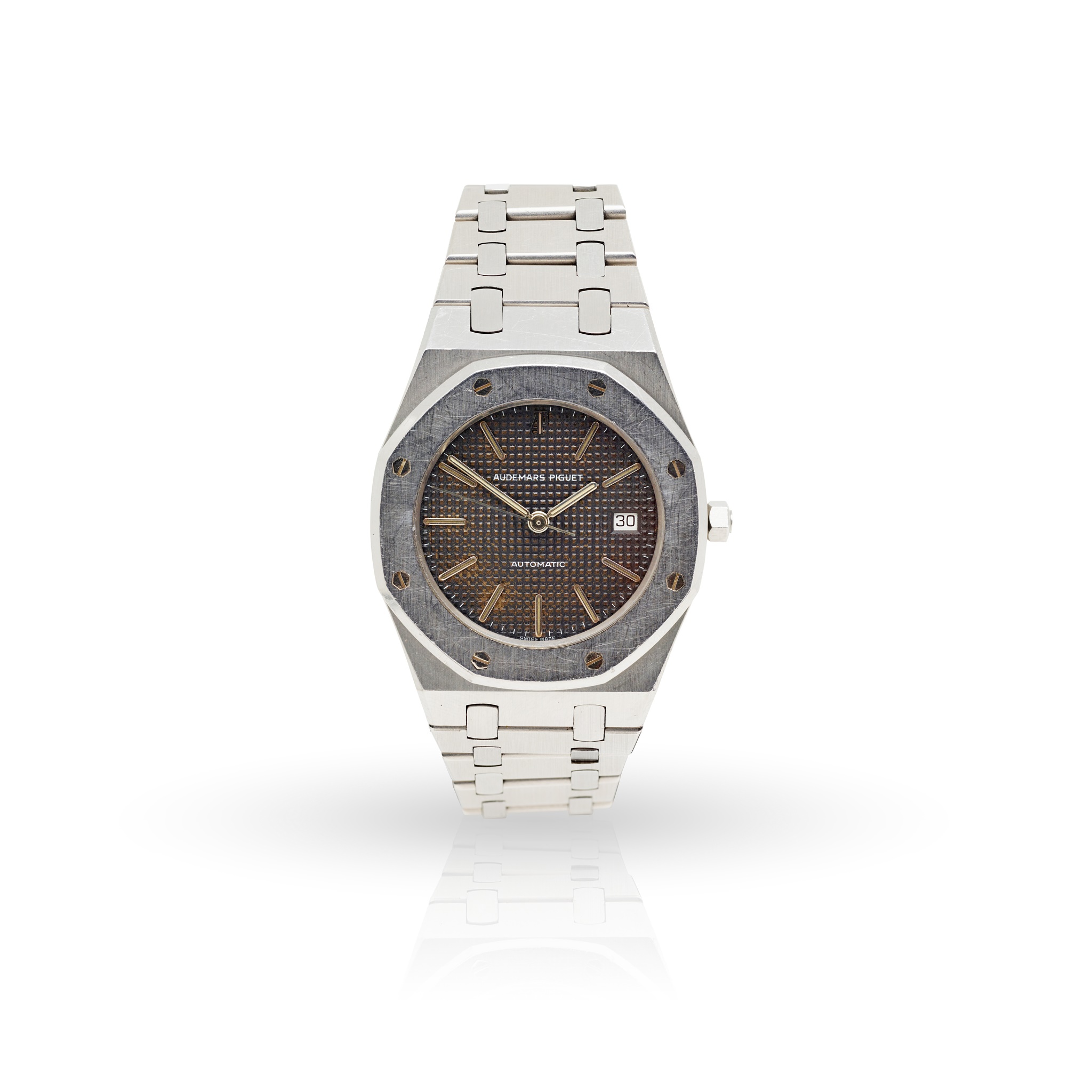Royal Oak model number 113, stainless steel case, automatic movement, round black tapisserie dial, AP logo at 12, stainless steel baton hour markers, date aperture at 3, stainless steel hands with lume inserts, centre seconds hand, stainless steel octagonal bezel with screw-head motifs, screw-down octagonal crown with AP logo, with ROYAL OAK No. 113 to the caseback, on a stainless steel bracelet strap with signed Audemars Piguet clasp, skeletonised AP to the interior, no box and papers