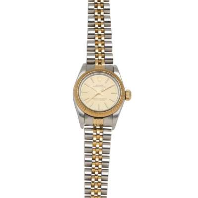 Oyster Perpetual model 67193, stainless steel case, automatic movement, 1988 from papers, originally purchased 1989, round champagne dial with coronet at 12, applied gold baton hour markers, gold hands with lume inserts, gold fluted bezel, gold screw-down crown with coronet, on a stainless steel Jubilee bi-colour bracelet, with 491B to the end link, with a signed Rolex foldover clasp with M11, 62523D.18, in box, with outer box, with papers and booklets