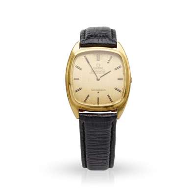 Constellation Automatic model, case marked 750, rounded square gold-coloured textured dial with applied black baton hour markers, black pencil hands, the case edge marked 750, on a later generic strap, in box, no papers, with pre-owned receipt dated 2009