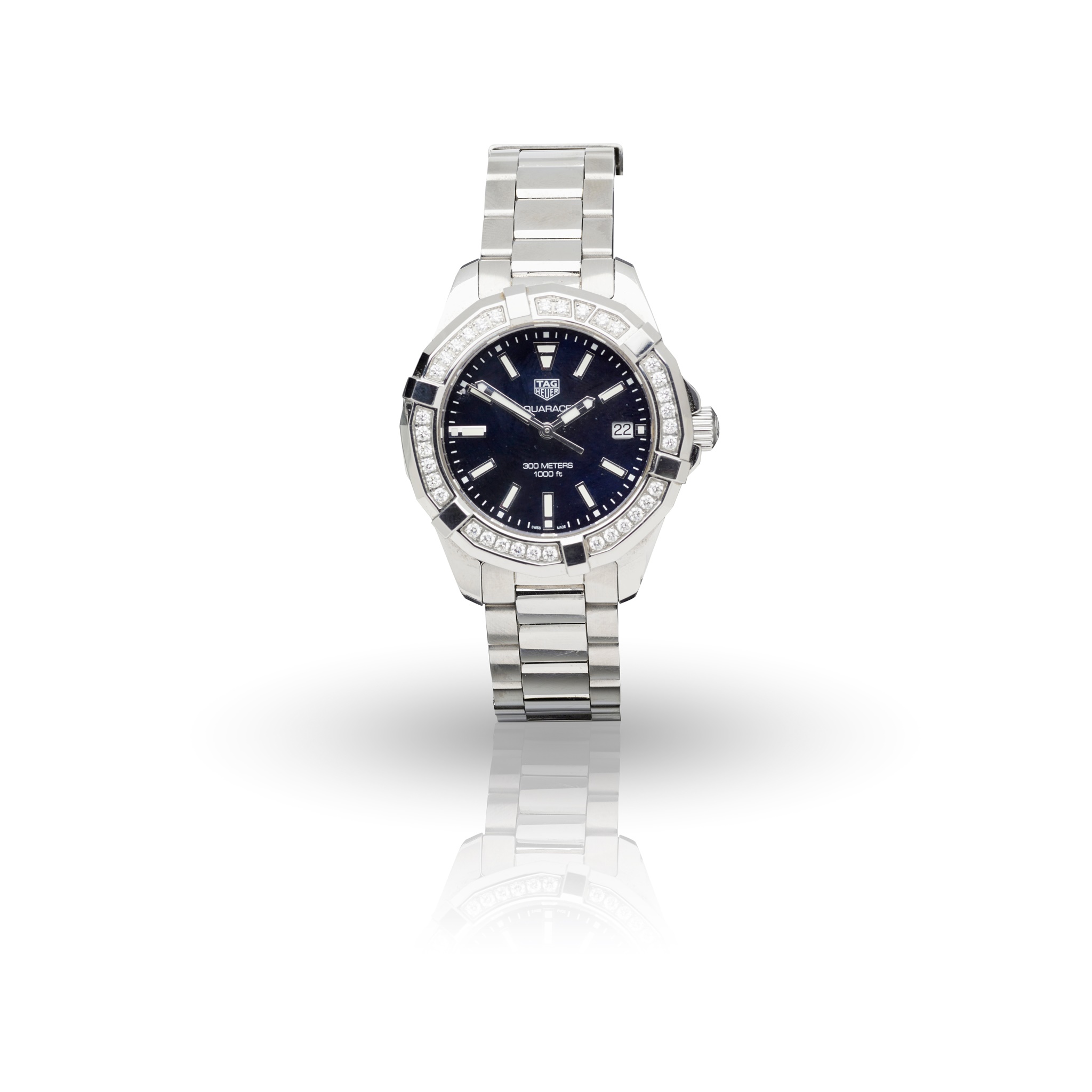 Aquaracer 300 meters model WAY131N, originally purchased 2015, stainless steel case, ETA quartz movement numbered 955412, round black dial with applied stainless steel-edged lume baton hour markers, date aperture at 3, stainless steel-edged lume hands, stainless steel centre seconds hand, outer seconds track in white, stainless steel diamond set bezel, serial number to the caseback, on a stainless steel bracelet strap with signed TAG Heuer clasp numbered G-S4, FAA106, with two additional links, in box, with outer box, with papers and booklets