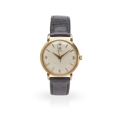 9ct gold case, signed Omega calibre 501 movement, round white dial with applied gold arrowhead hour markers with lume plots to the angles, outer seconds track, sword hands with lume inserts, Omega logo to crown, the caseback with engraved monogram, the inside of the caseback marked DENNISON and numbered 13308, 993214, on a later generic strap, no box and papers
