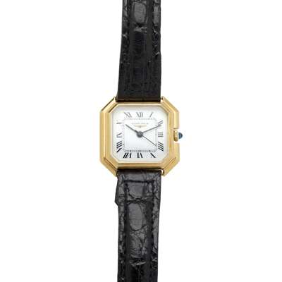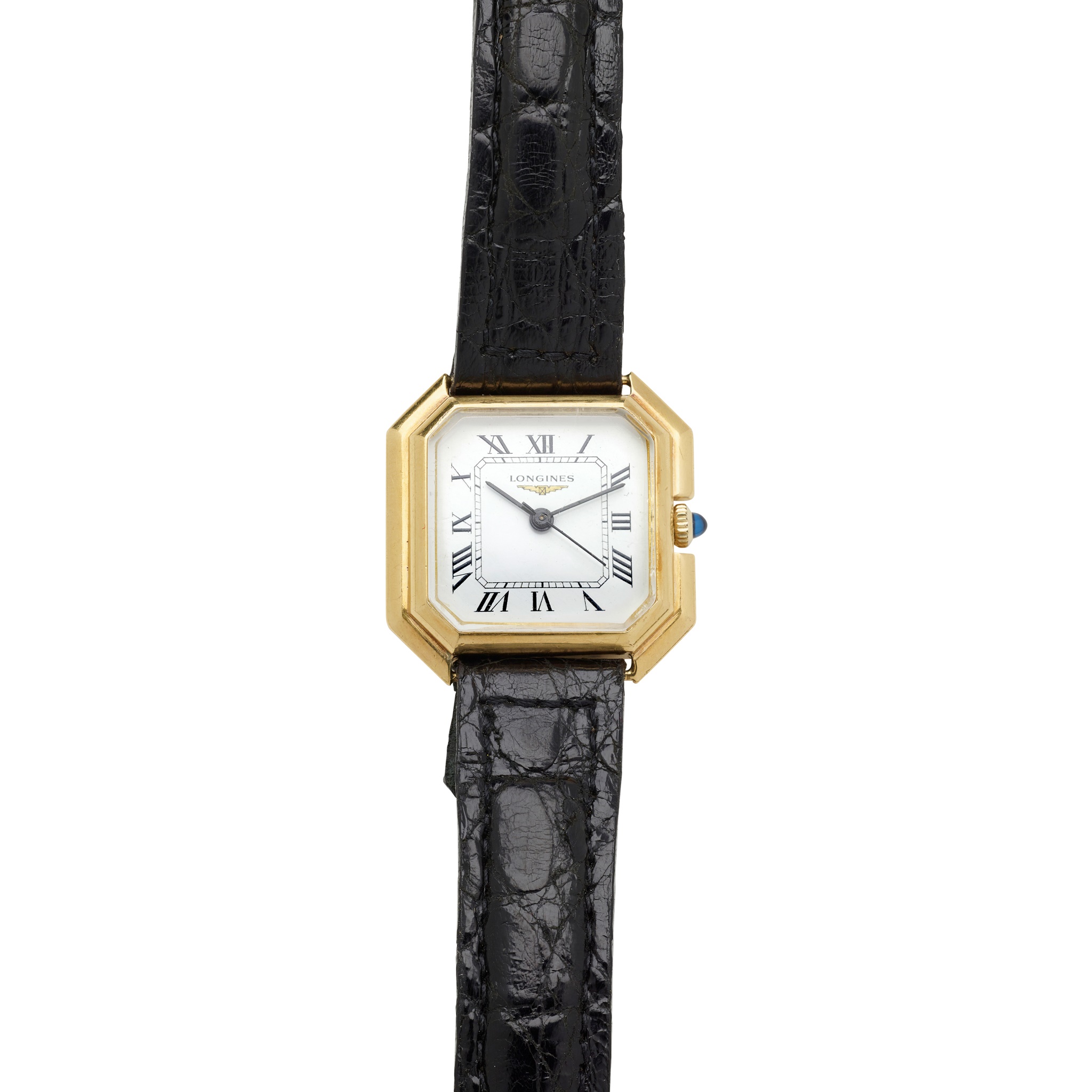 case marked 18K, signed Longines 17 jewel manual wind movement, octagonal white dial with Roman numerals in black, inner railroad seconds track in black, black pencil hands, octagonal stepped case, blue cabochon set crown, on a generic strap, no box and papers