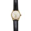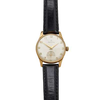 to include a Bulova 18ct gold case, signed Bulova calibre 11 AFC manual wind movement, 1960s, round silvered dial with applied gold baton hour markers, outer seconds track, gold bevelled sword hands, centre seconds hand also in gold, the caseback with engraved monogram and dated 1965, metal crown, on a generic black strap, no box and papers; and a Zenith with 9ct gold case, signed Zenith 17 jewel movement, 1950s, round silvered dial with applied gold Arabic numerals, sunken small seconds at 6, gold sword hands, engraved initials to the caseback, on a later generic strap, no box and papers