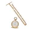 half hunter, keyless wind, 18ct gold case with partial hallmarks, the casefront with Roman numerals enamelled in blue around aperture, white enamel dial with Roman numerals in black, sunken small seconds at 9, railroad outer seconds track in black, along with an unmarked watch chain formed by anchor links, with T-bar appendage and dog clip clasp