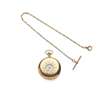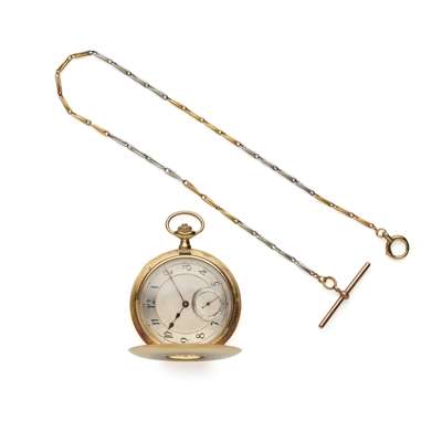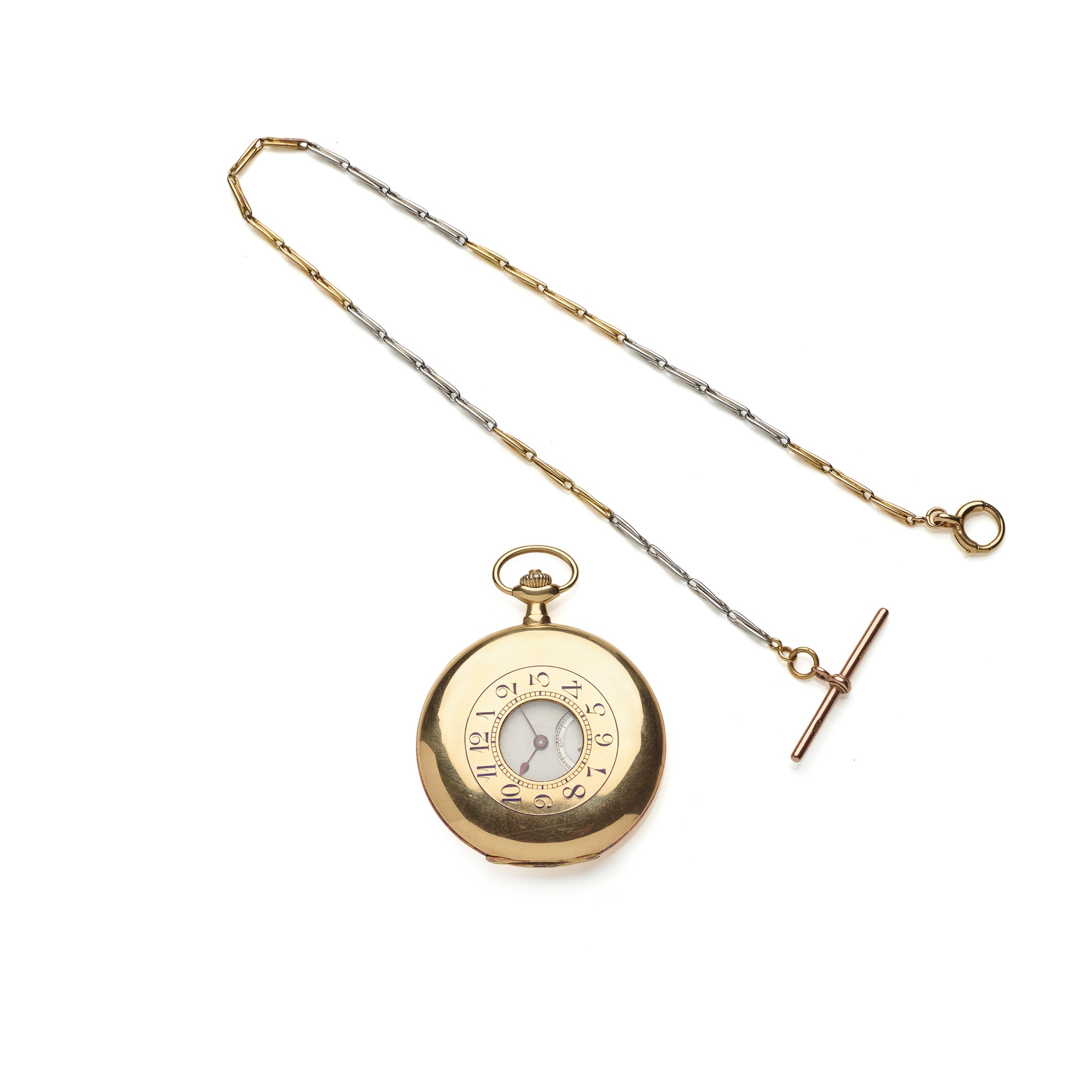 half hunter, keyless wind, the case front with Arabic numerals enamelled in blue, with inner seconds track around the aperture, silver-coloured machined dial with Arabic numerals in black, small seconds at 6, black dot outer seconds track, leaf hands, the movement cover with TO H.M. THE KING and with Le Roy et Fils address, with import marks and 18ct, in a green leather silk-lined case for Le Roy et Fils, New Bond Street, along with a bi-colour watch chain, with lobster clasp and T-bar, the bar marked M.D. 9.375