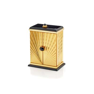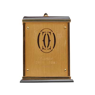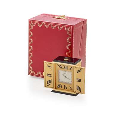 model 8915, serial number 03380, originally purchased 1991, in the Art Deco style, Gilt and onyx case, the case with doors with engraved sunburst radiating lines, onyx set handle, opening to reveal the sunken signed white dial, lacking numerals, black hands with lume lots, gold-coloured alarm hand, the border in gilt and with large Roman numerals in black and continuing onto the inside of the doors, cabochon gem-set crown to the top of the case, the caseback pierced with Cartier logo and signed, with model and serial numbers, in box, with outer box, with papers and receipts and booklet