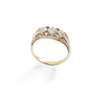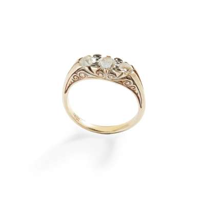 claw-set with three graduated old round-cut diamonds, scrolling detail to the gallery, the plain band stamped 18CT