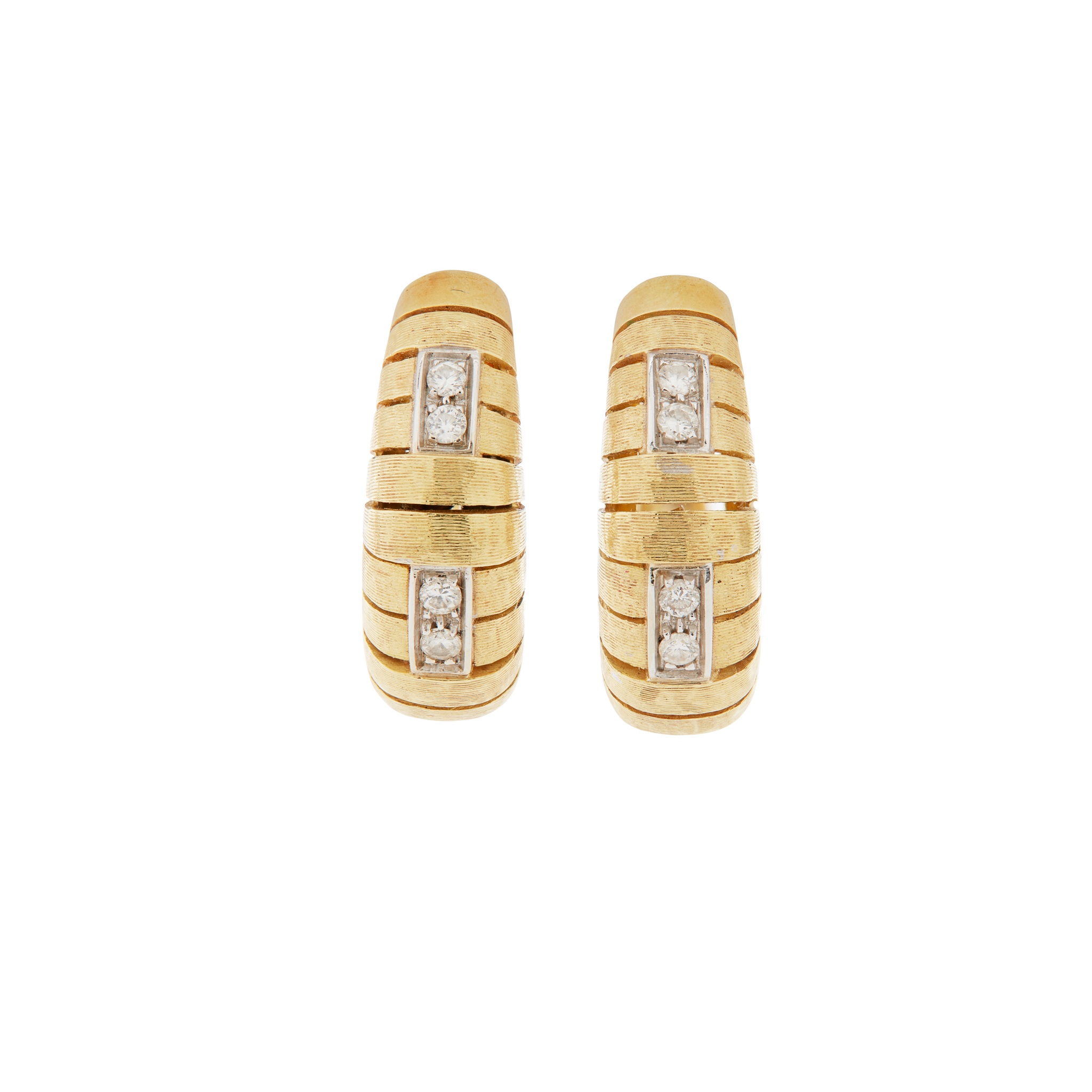 each earring with textured finish set with three pairs of round brilliant-cut diamonds, to post and clip fittings, stamped 750