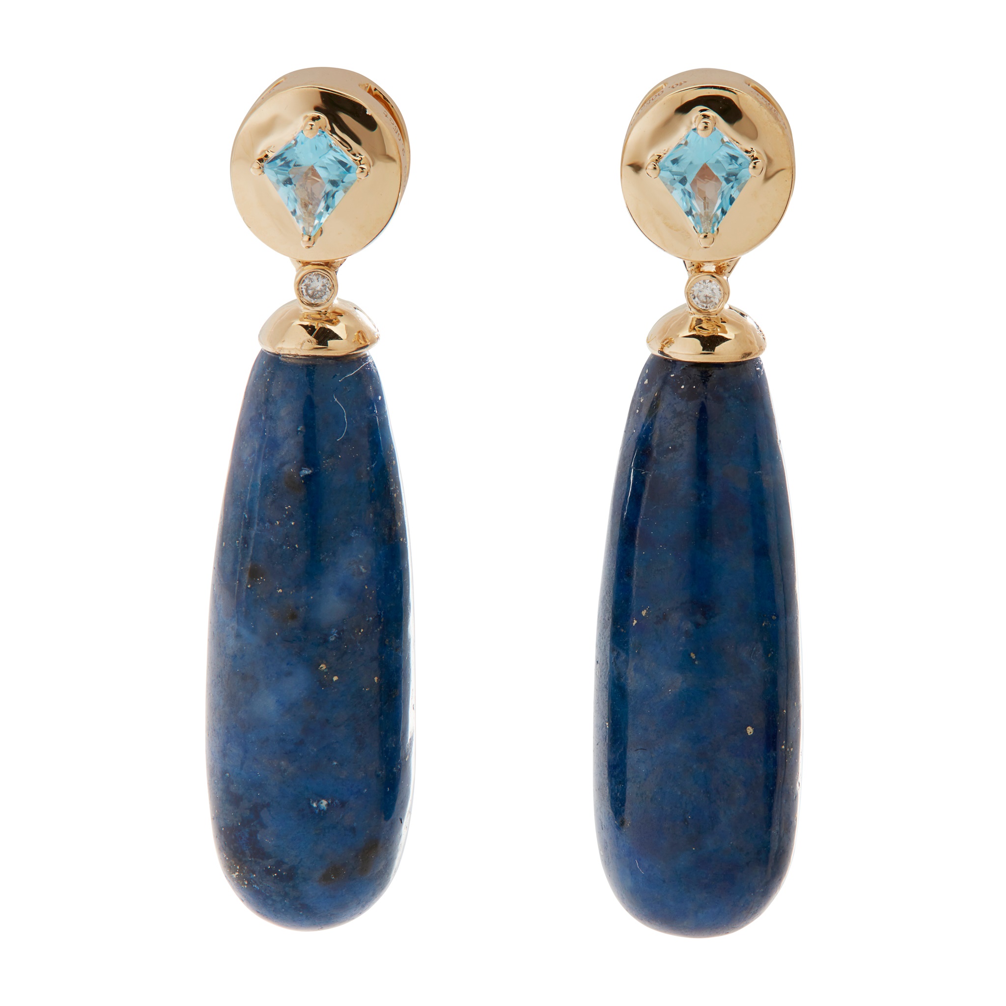 each set with a kite-shaped blue topaz, a small round-cut diamond and a polished lapis lazuli drop, to post fittings, stamped 750