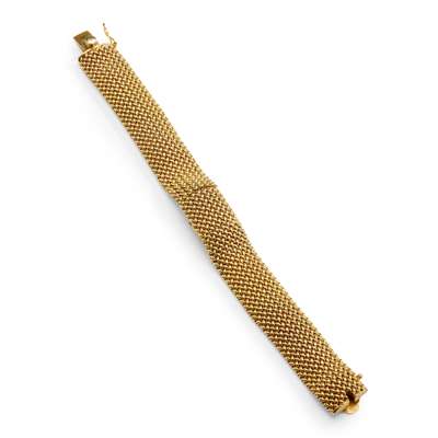 the case integrated within a woven bracelet strap, with a hinged cover opening to reveal the rectangular dial signed 'Genève,' with applied baton hour markers, leaf hands, the bracelet clasp marked 14k, no box and papers