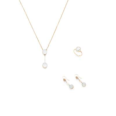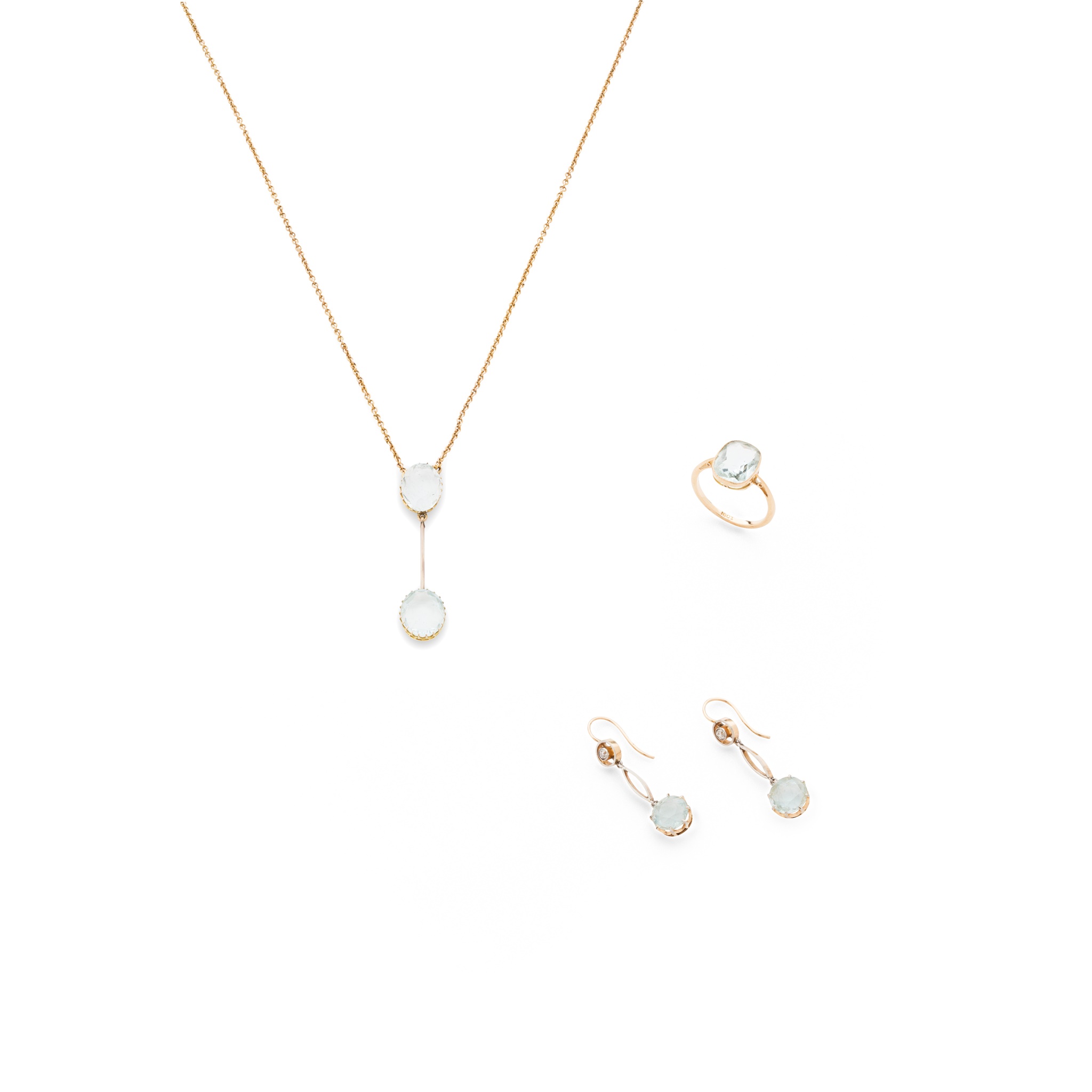 to include a ring, stamped 18ct; a pair of aquamarine and diamond pendent earrings, to hook fittings, unmarked; and a pendant necklace
