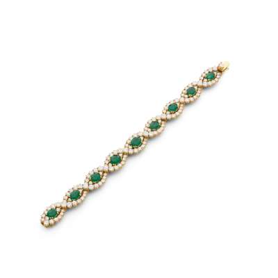 claw-set with nine oval-cut emeralds, in a scrolling border of graduated round brilliant-cut diamonds, to a concealed clasp, stamped 750