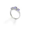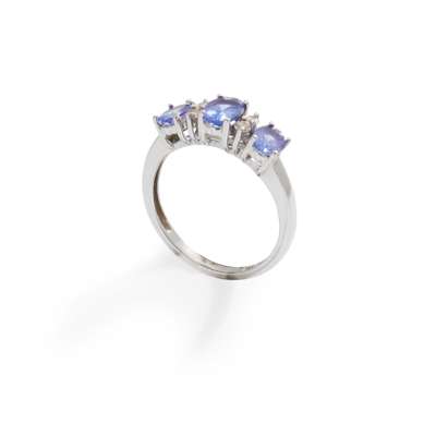 claw-set with three graduated oval-cut Tanzanites and four small round brilliant-cut diamonds, to a plain band stamped 18k