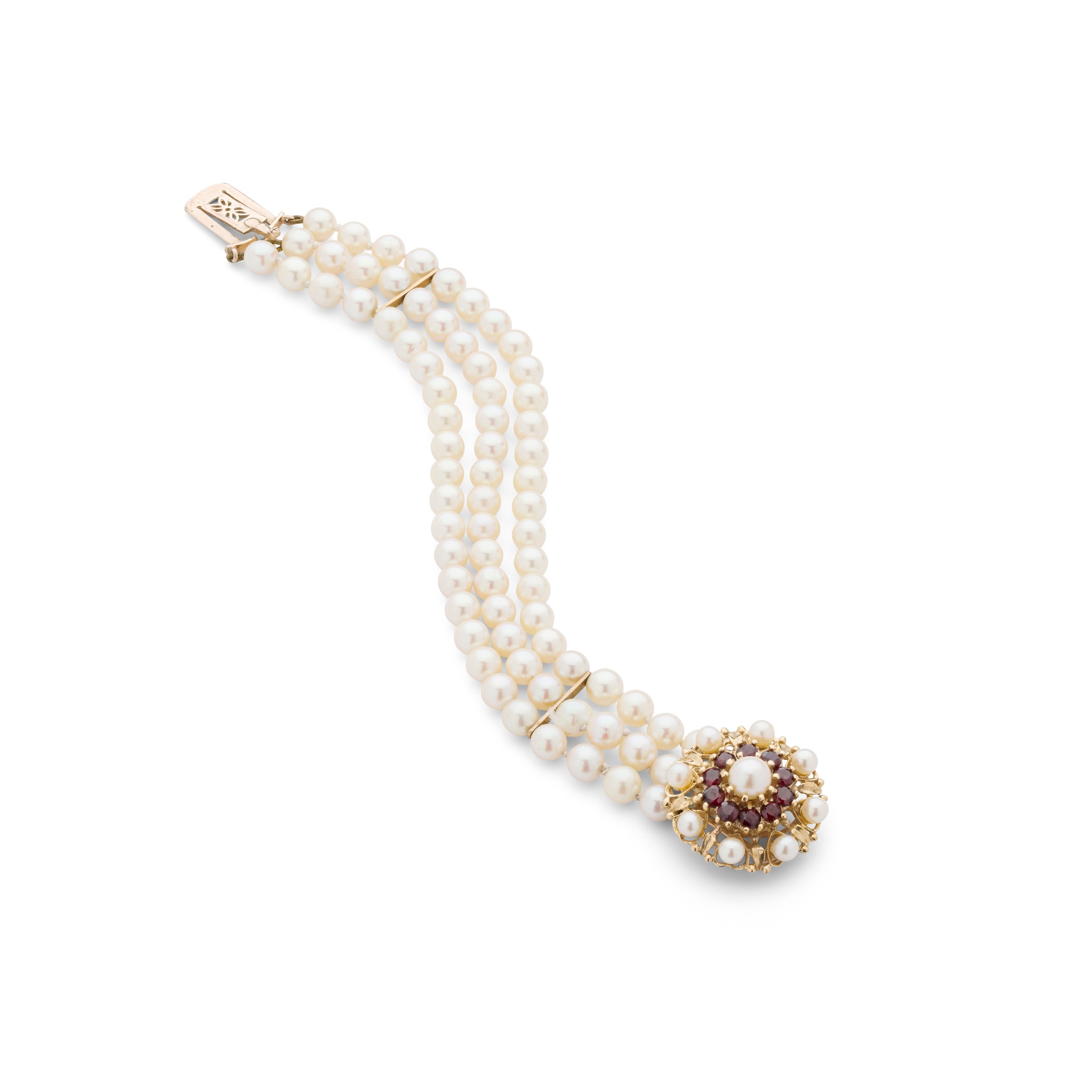 composed of three rows of cultured pearls, the circular clasp set with ten round-cut garnets and nine cultured pearls, stamped 9ct