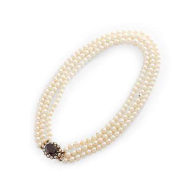 composed of three rows of graduated cultured pearls, the clasp set with an oval-cut garnet in a border of half-pearls