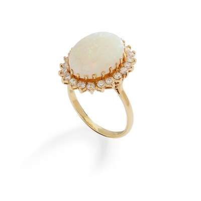 claw-set with an oval cabochon opal, in a border of round brilliant-cut diamonds, to a plain 18ct gold band