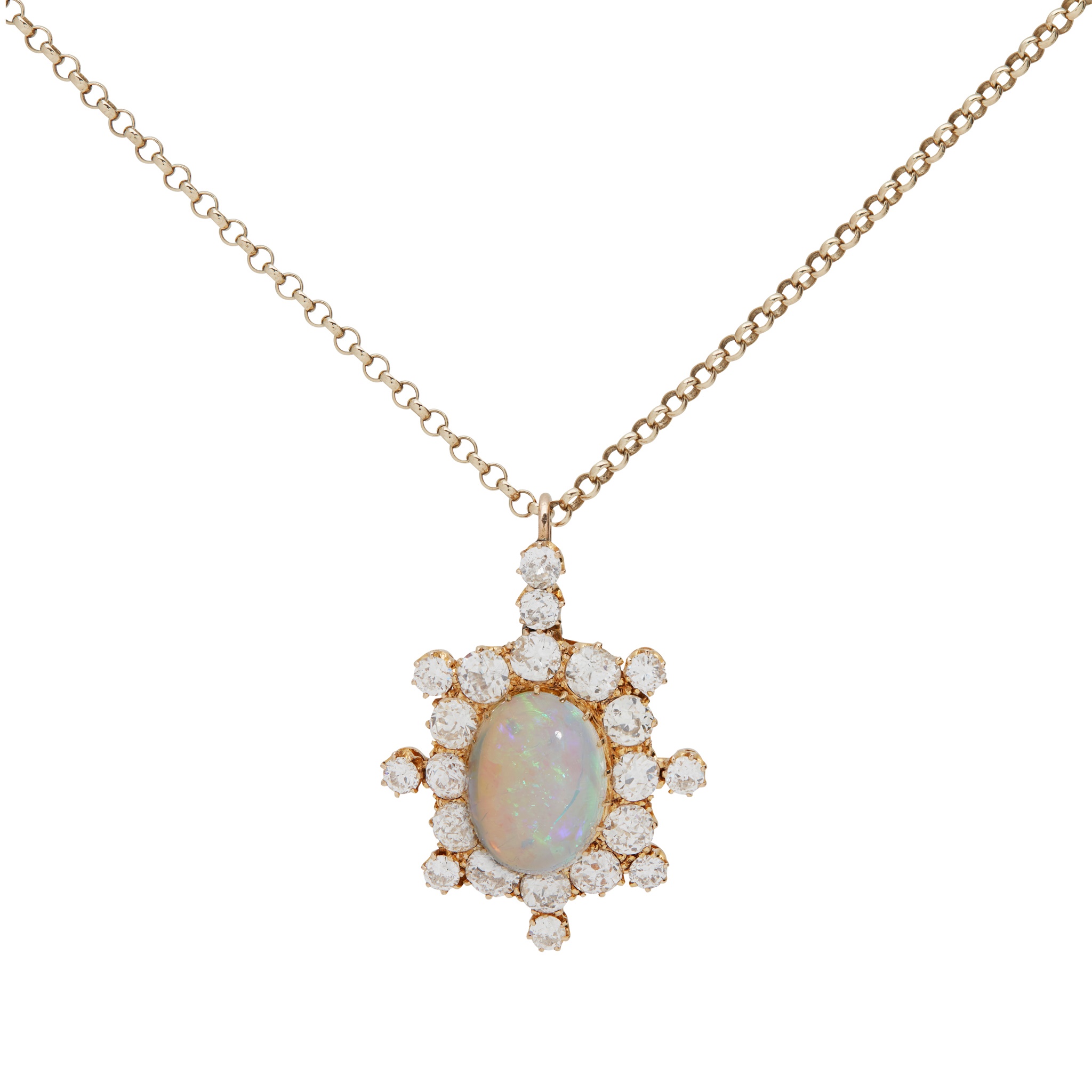 claw-set with an oval cabochon opal, in a border of graduated old round-cut diamonds, unmarked, to a 9ct gold belcher link chain