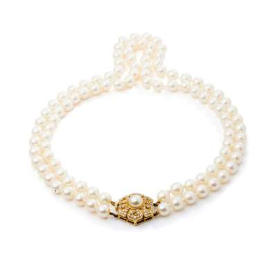 composed of two rows of cultured pearls, to a cultured pearl and diamond set flower head clasp, modelled in 18ct gold
