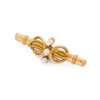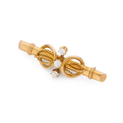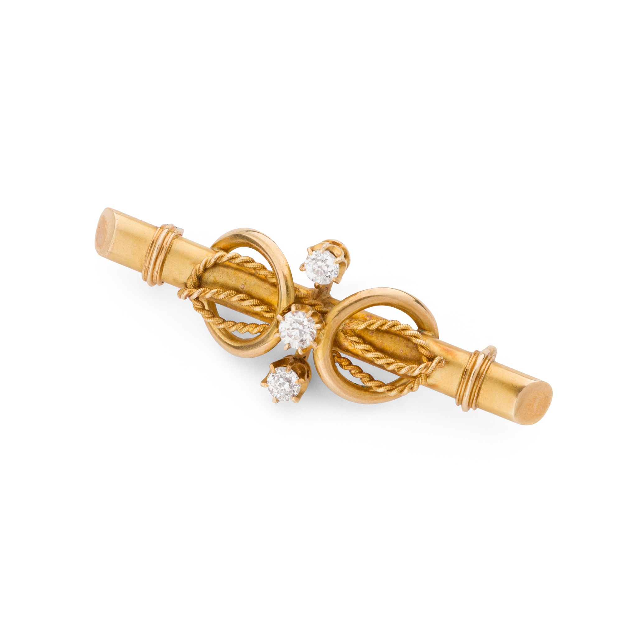 the bar brooch with scrolling rope-twist detail, claw-set with three old round-cut diamonds, stamped 18ct