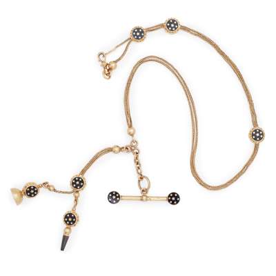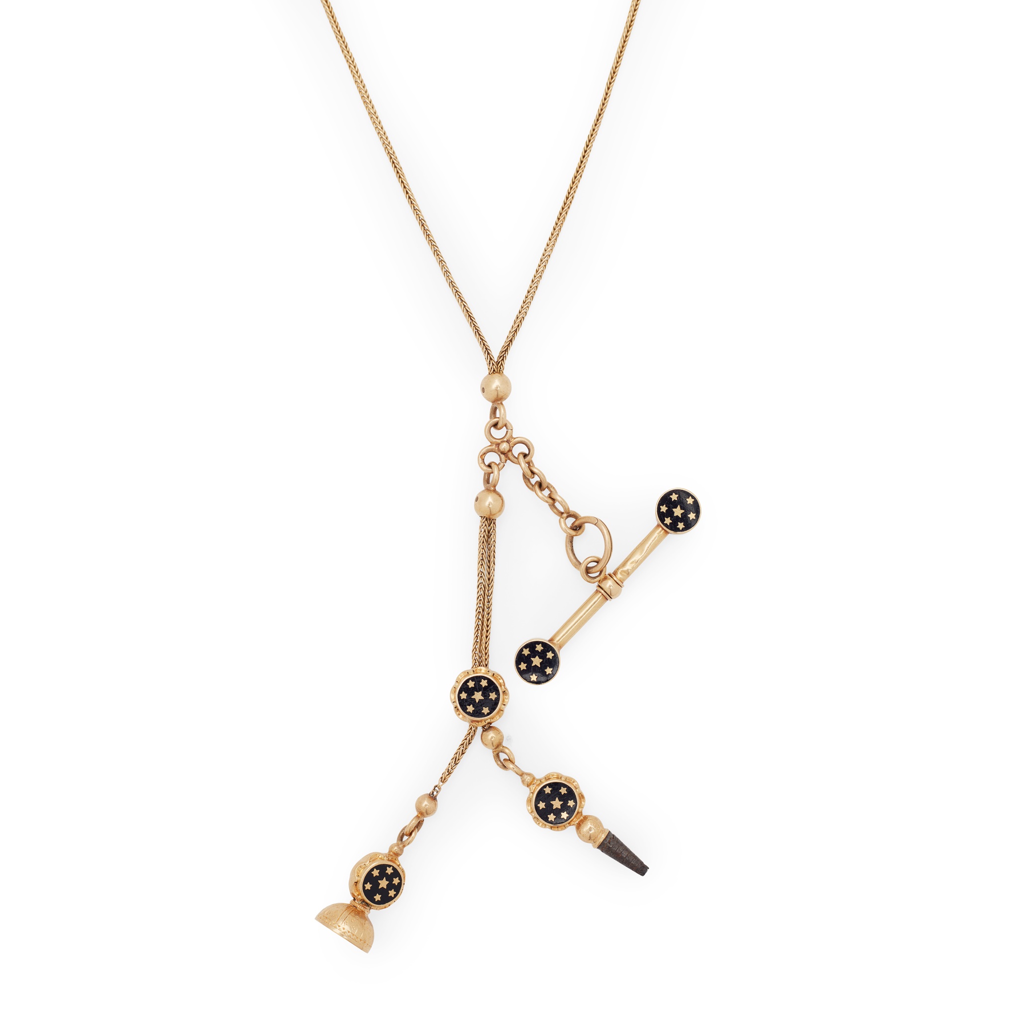 the woven chain with sliding links with enamelled night sky detail, the T-bar, watch-key and fob pendants all with similar detail, French marks