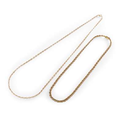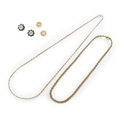 to include two 9ct gold fancy-link chains, a pair of 9ct gold sapphire and diamond cluster earrings, and a pair of colourless gem-set stud earrings