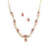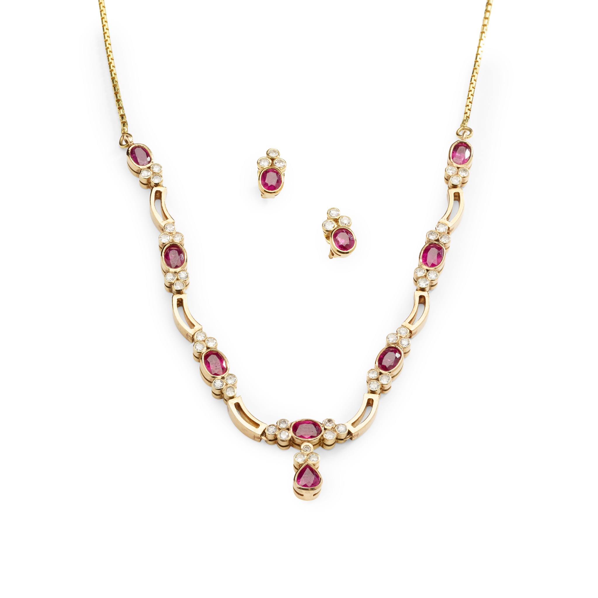 collet-set with oval-cut rubies and trios of small round brilliant-cut diamonds, the necklace to a box-link chain, stamped 585; the earrings to post and butterfly fittings, unmarked