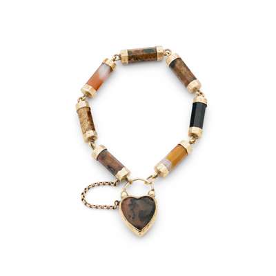 each baton link set with a polished agate, to an agate-set heart-shaped padlock clasp with glazed panel to reverse, unmarked