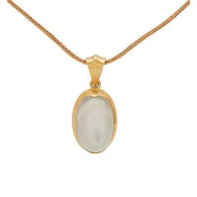 set with an oval cabochon moonstone in a plain mount, stamped 750, to a woven link necklace
