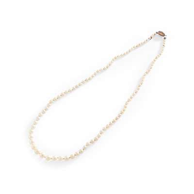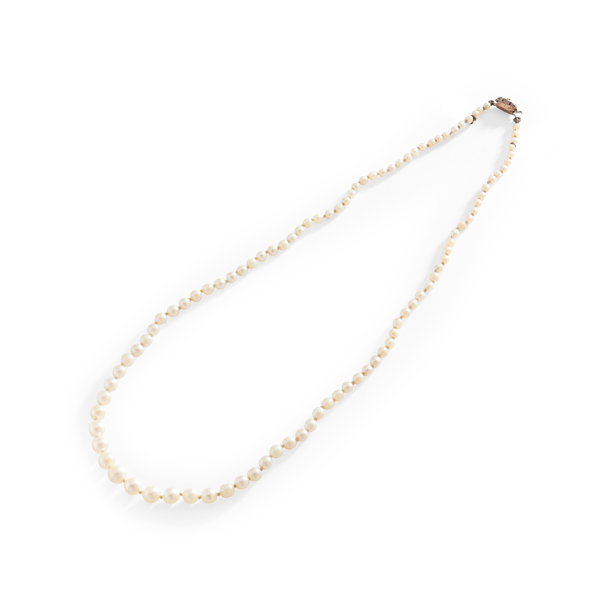composed of a single strand of graduated pearls (untested), the clasp set with three graduated French-cut diamonds, unmarked