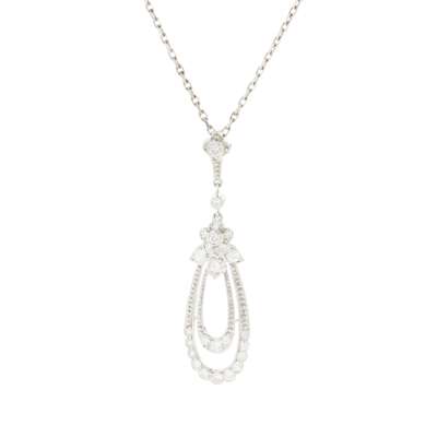 the drop-shaped pendant with floral detail set throughout with graduated round brilliant-cut diamonds, to trace link chain, unmarked
