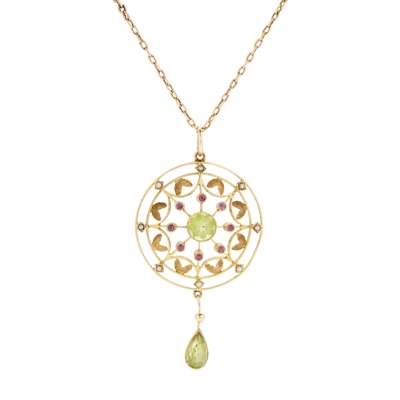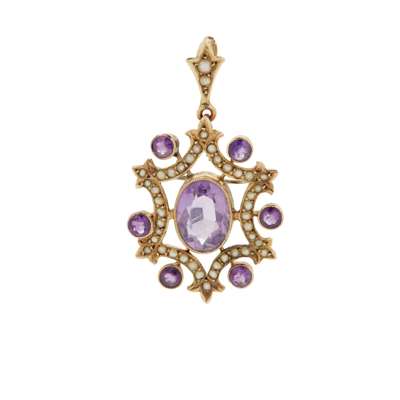 the first of open circular design, set with a central peridot, round-cut rubies and seed pearls, stamped 15ct; the second of scalloped outline, set throughout with amethyst and seed pearls, stamped 9c