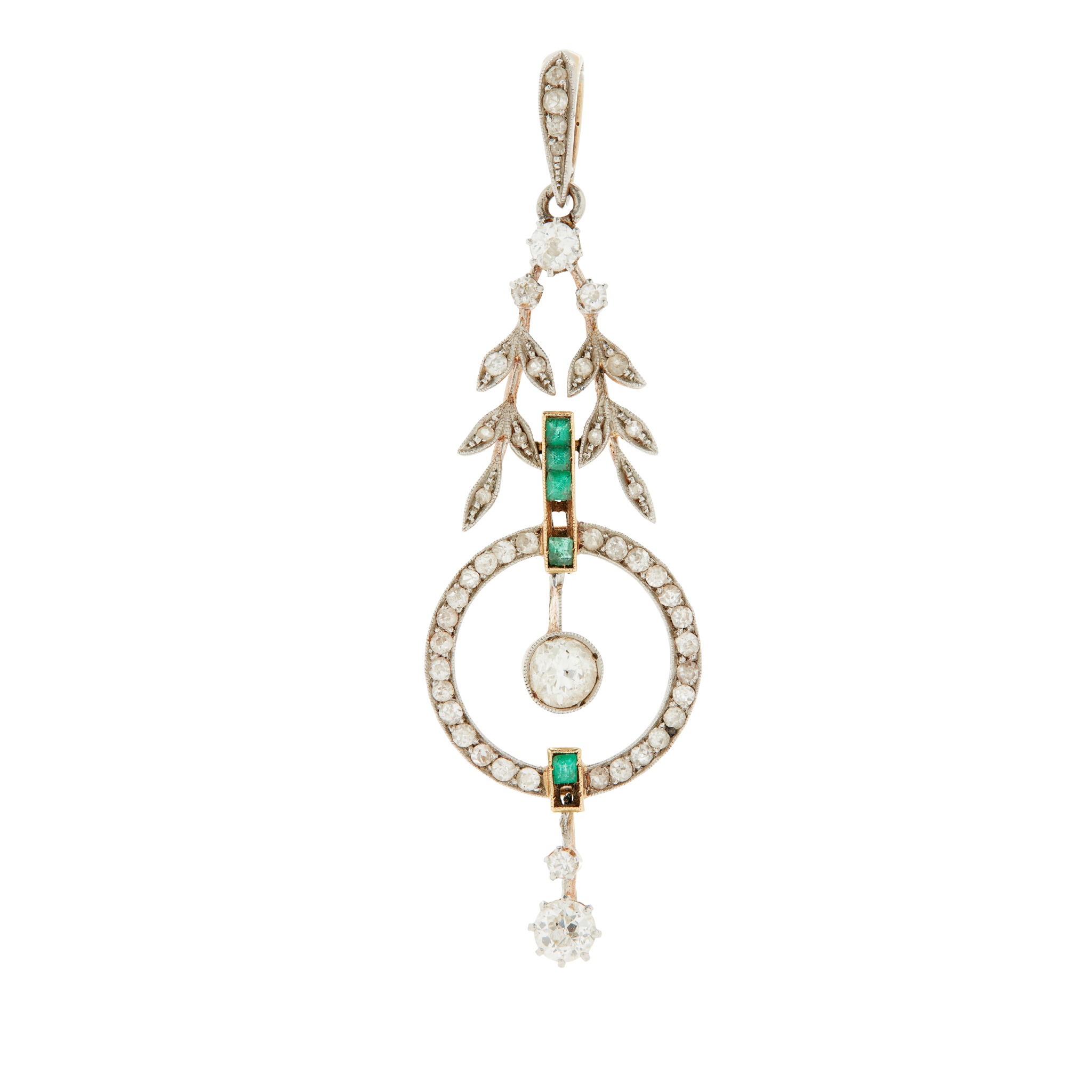 the foliate drop suspending a circular pendant set throughout with rose-cut diamonds, channel-set emerald detail, central milliegrain diamond pendant, unmarked