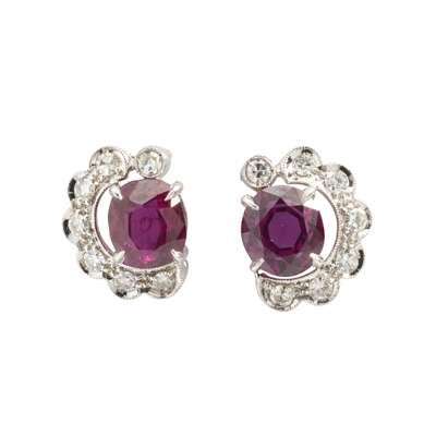 each claw-set with an oval-cut ruby, in a millegrain-set half-border of eight-cut diamonds, to post and butterfly fittings, unmarked