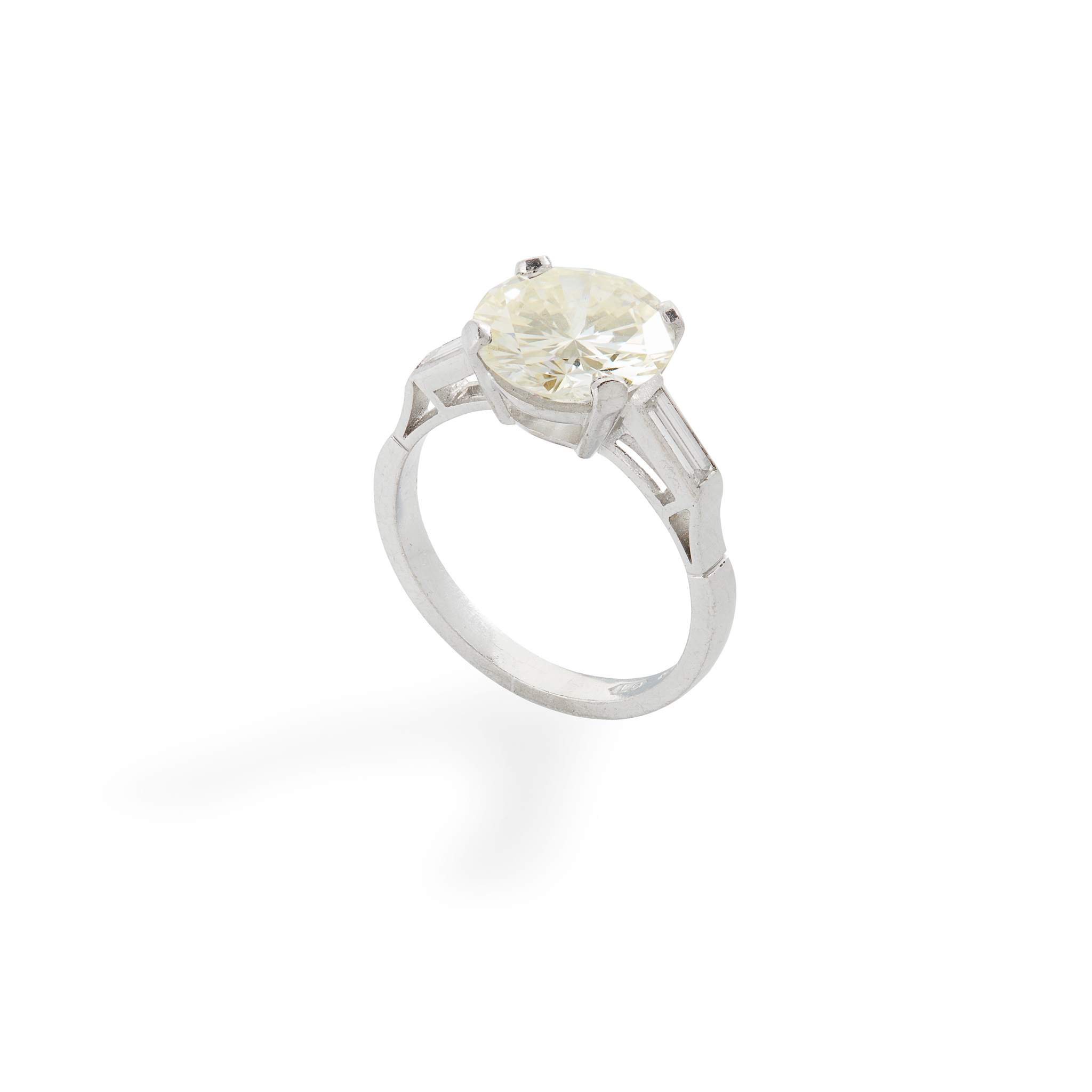 claw-set with a round brilliant-cut diamond, each shoulder set with a baguette-cut diamond, to a plain 18ct white gold band