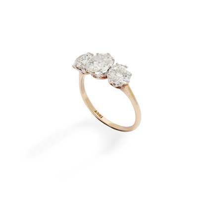 claw-set with three graduated old round-cut diamonds, to a plain band, stamped 18ct