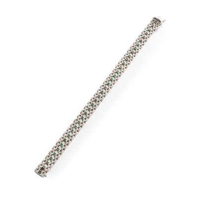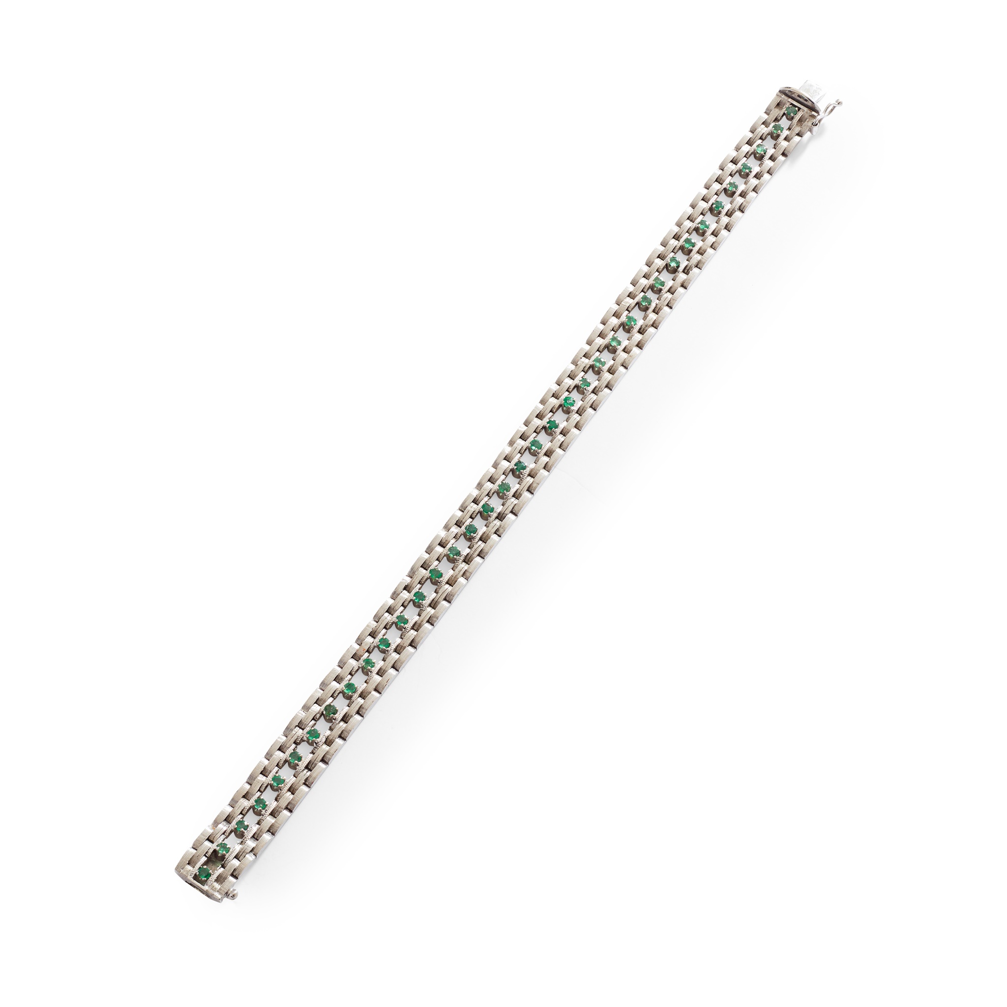 composed of brick links with a brushed effect, set with a central row of small round-cut emeralds, stamped 750