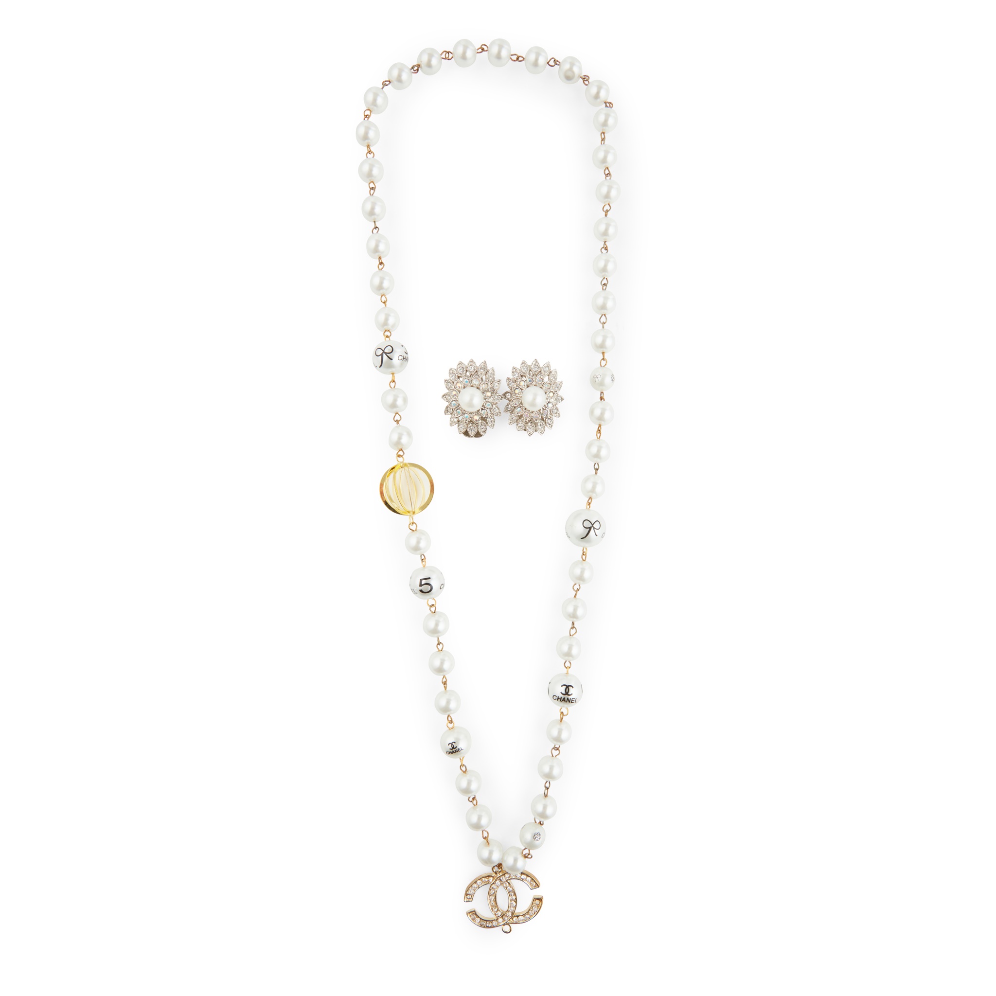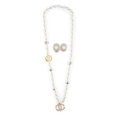 the double-C pendant set with colourless pastes, together with a pair of faux pearl and faux diamond earrings