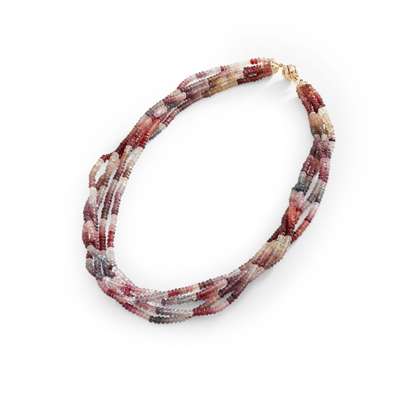 composed of four strands of facetted ruby and various coloured sapphire beads, to a globular clasp, stamped 585