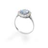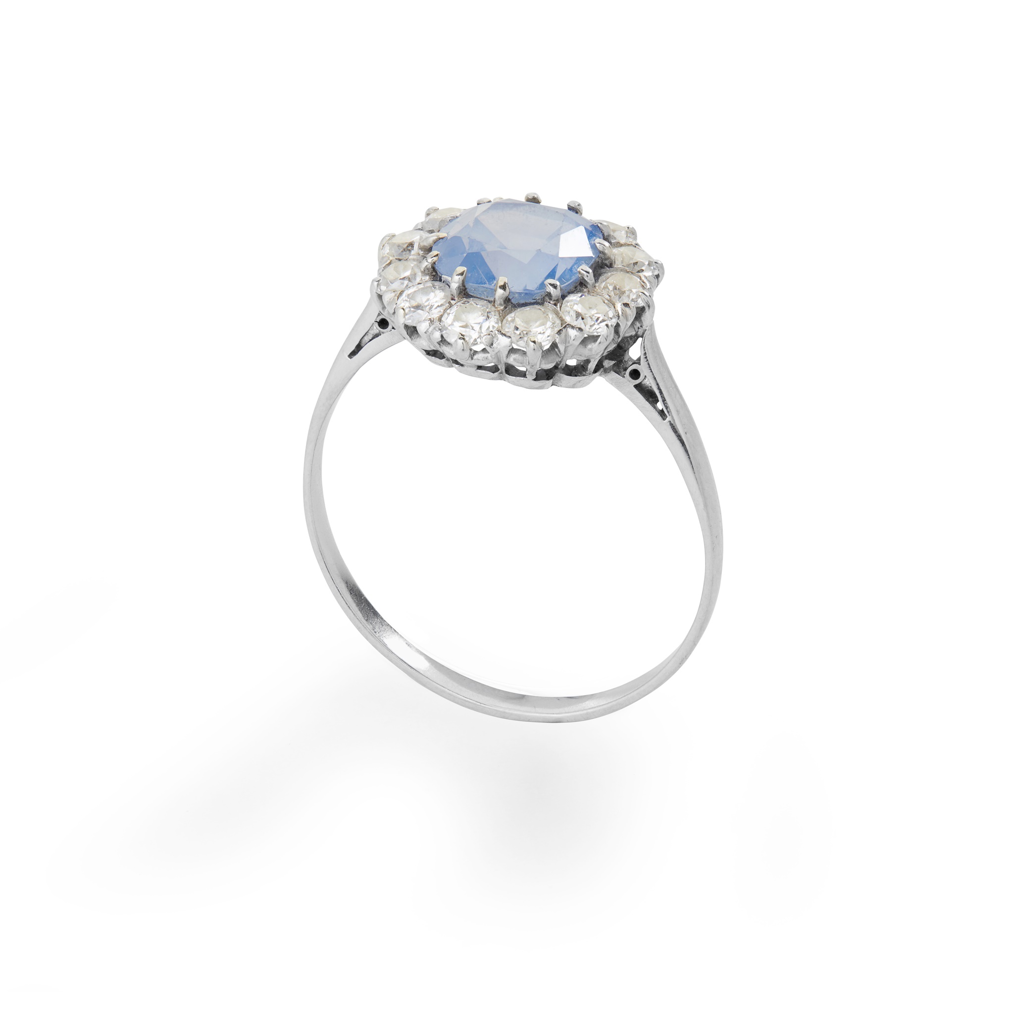 set with a cushion-cut light-blue sapphire, in a border of old round-cut diamonds, to a plain band, unmarked