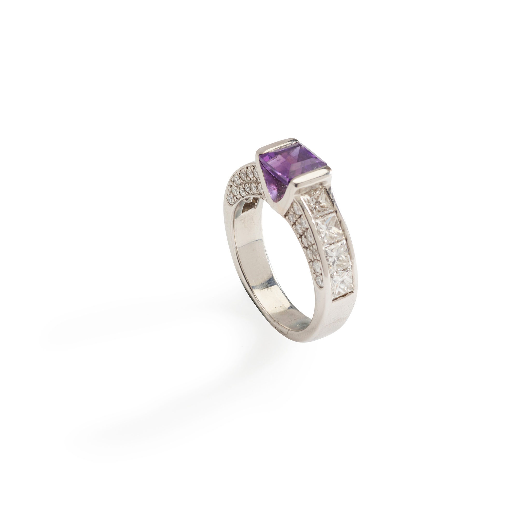 bar-set with a square step-cut amethyst, each shoulder channel-set with four princess-cut diamonds, the gallery pavé-set with graduated round brilliant-cut diamonds, unmarked