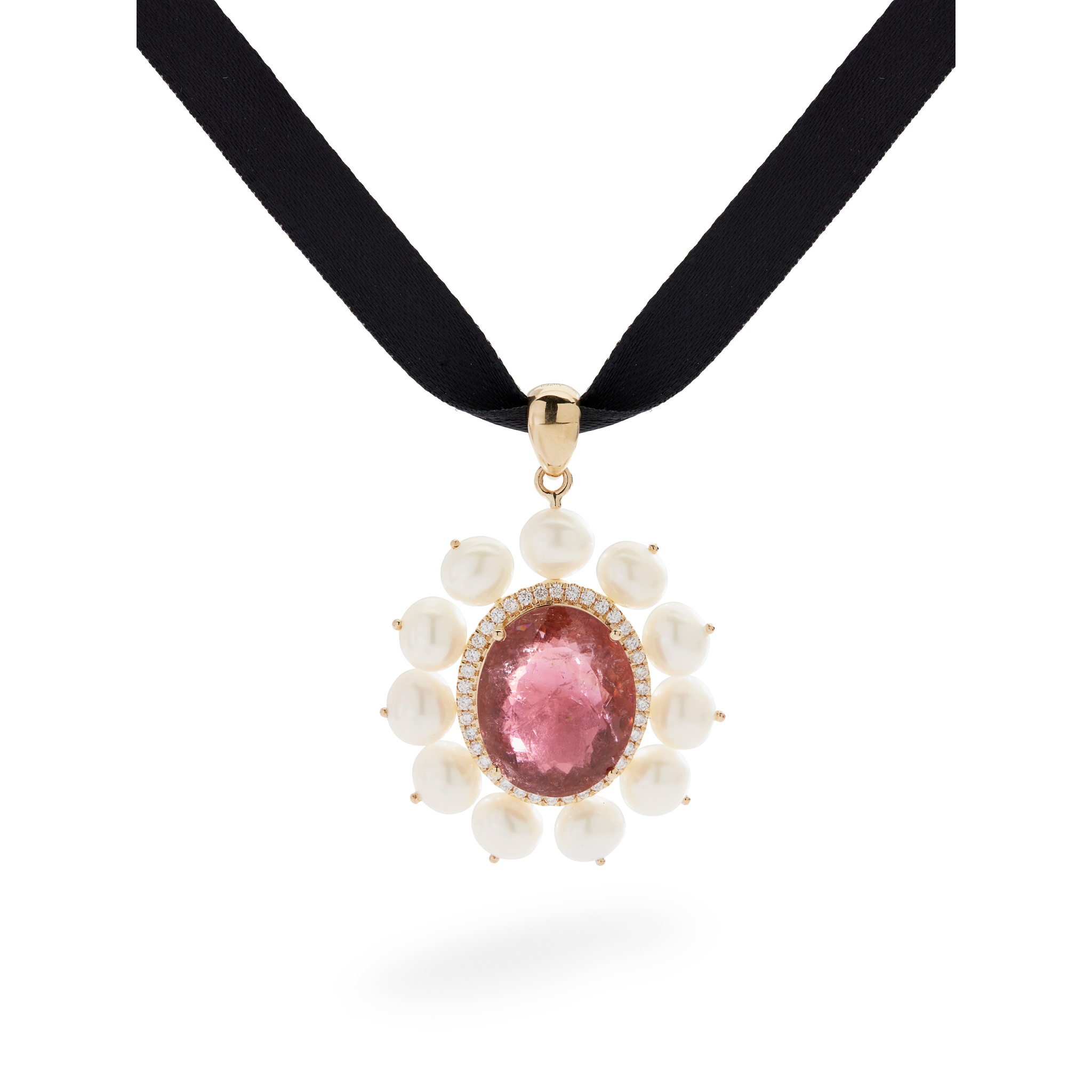 claw-set with a large oval-cut pink tourmaline, in a border of small round-cut diamonds and eleven cultured pearls, stamped Au750, to a black ribbon necklace