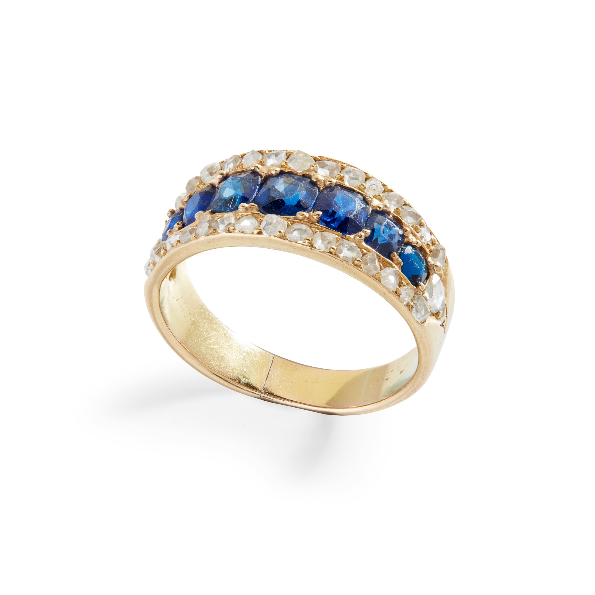 set with a row of seven graduated cushion-cut sapphires, in a border of rose-cut diamonds, to a plain band, unmarked